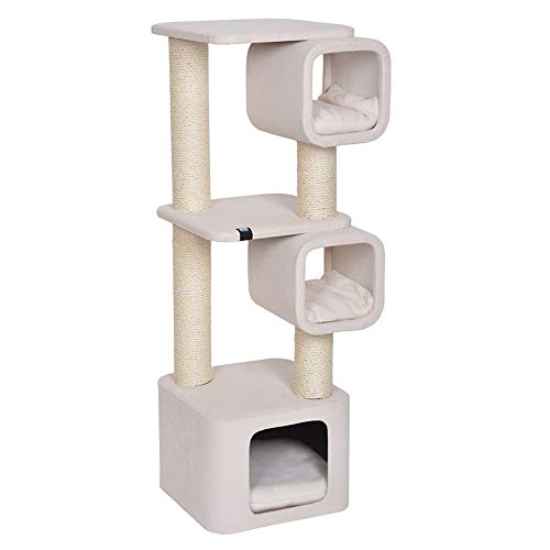 Ebi, Arbre à Chat Modèle Akita 37x37x111 cm Blanc, avec Deux Tunnels et abri pour se détendre, Tissu avec Mousse Confortable, Abri avec Coussin en Peluche, en sisal et Tissu