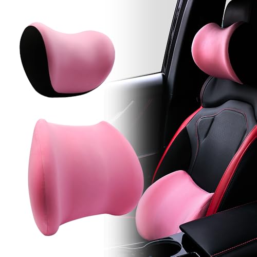ODIWEN Coussin Lombaire + Appui-tête, Appui Tete Voiture+Coussin Lombaire Voiture, Oreiller Appui-Tête De Siège De Voiture, Repose-Tête, pour Chaise de Bureau et Voiture (Rose)