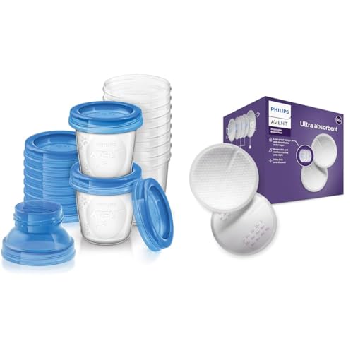 Philips AVENT Système de Conservation du Lait Maternel, Pots de Conservation180 ml, Couvercles Vissables et Adaptateur & 60 coussinets d'allaitement jetables - jour et nuit (modèle SCF254/61)