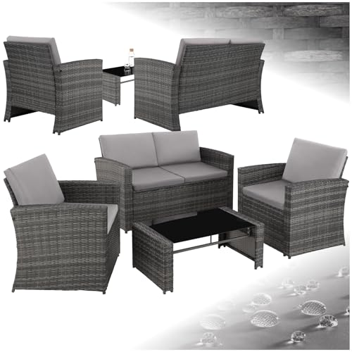 TecTake Salon de Jardin en Résine Tressée 4 Personnes, 1 Canapé, 2 Fauteuils, 1 Table avec Plateau en Verre, Coussins d’Assise et de Dossier Inclus (Gris/Gris Clair) Regular