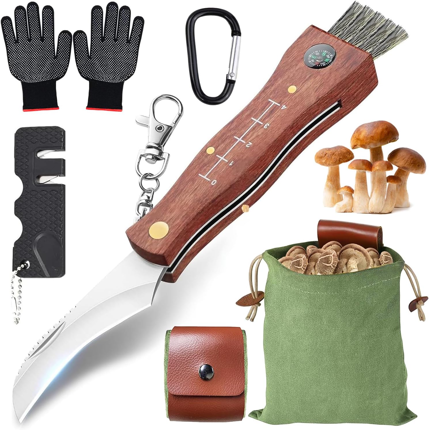 NouvelHorizonstore-Couteau à champignons avec brosse, sac éponge, couteau à champignons de haute qualité, ramasser des champignons/muguets, brosse, acier inoxydable, sac, gants, boussole et règle