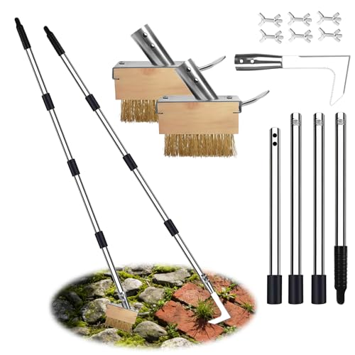Brosse à Mauvaises Herbes et Couteau Désherbeur avec Manche Télescopique(160cm), Lot de 2 Brosses À Joints pour Mauvaises Herbes avec Crochet pour Éliminer la Mousse et Les Mauvaises Herbes (Argent)