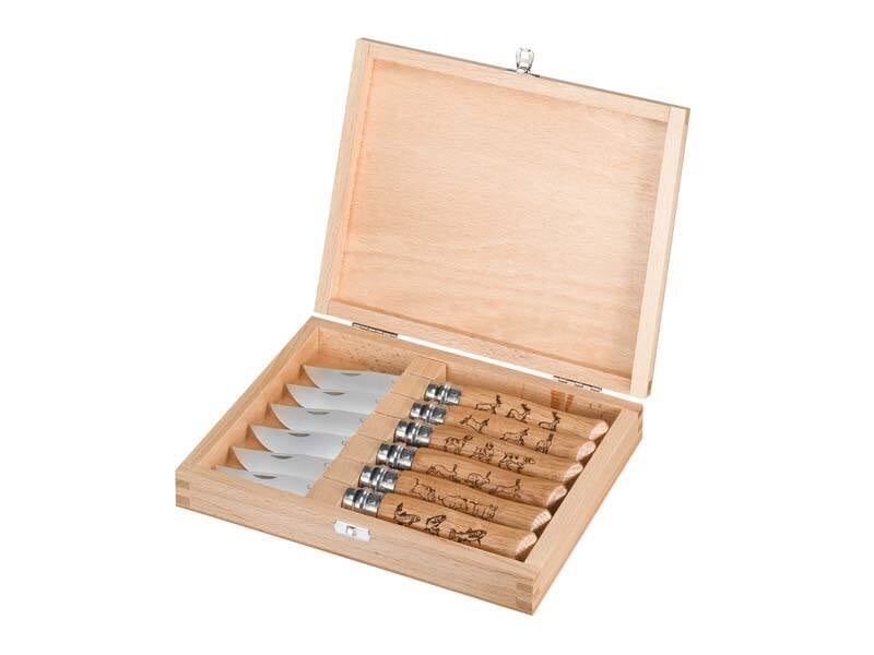 Couteau Opinel, taille 8, collection Animalia, boîte en bois,,, Set de 6 couteaux, acier Sandvik 12C27, inoxydable, bois de chêne