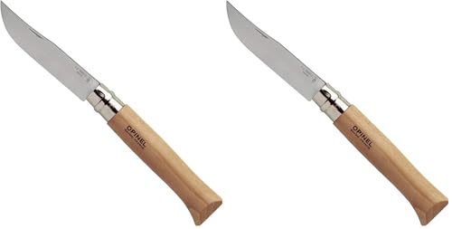 OPINEL Couteau N°8, Acier inoxydable Martensitique, Facilité d'entretien, Résiste à la corrosion, Manche en hêtre vernis incolore, Lame Yatagan de 8,5 cm, Avec bague de double sécurité Virobloc