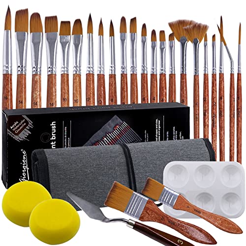 FENORKEY Lot de 25 pinceaux de peinture acrylique professionnels avec rouleau de toile et couteau à palette pour peinture à l'huile, acrylique, gouache et aquarelle