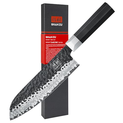 SHAN ZU Couteau Santoku Japonais 19 cm, Forgé à la Main,7 Couches Acier professionnel Japonais Tranchant en Acier 10Cr15MOV - TAKUMI Series