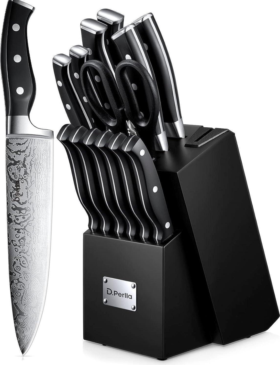 Bloc à couteaux avec couteau 14 TLGBloc à couteaux auto-affûtant Set de couteaux en acier inoxydable tranchants avec manche en plastique et bloc en bois Set de couteaux de cuisine professionnels Noir