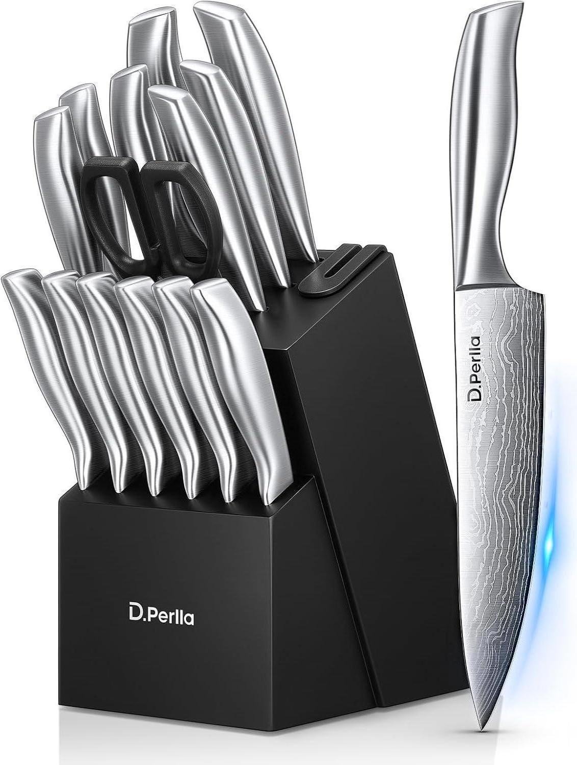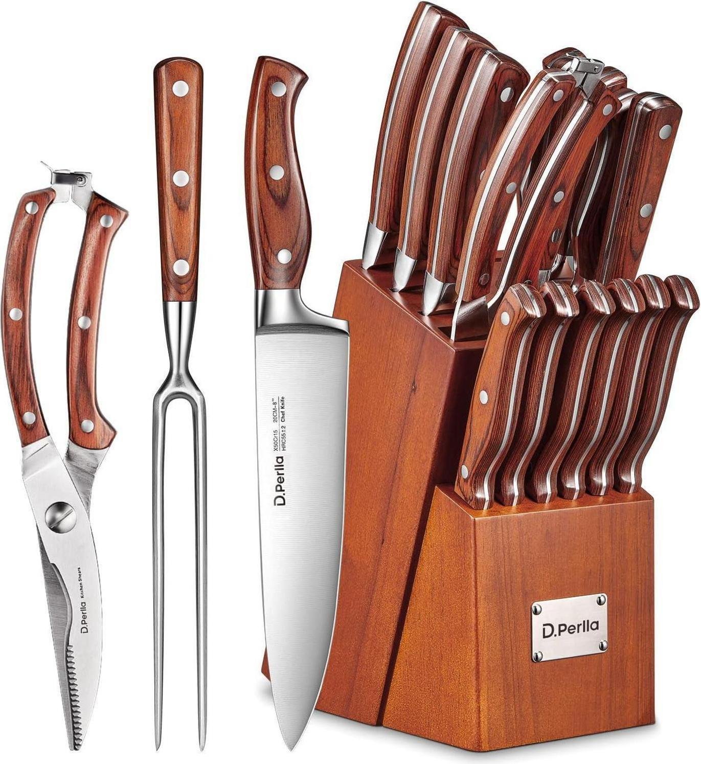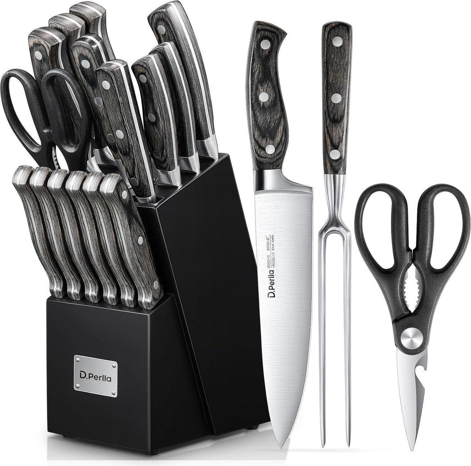 KATISUN Set de 15 couteaux Acier allemand 1.4028, manches polis, bloc de couteaux, couteaux de cuisine professionnels