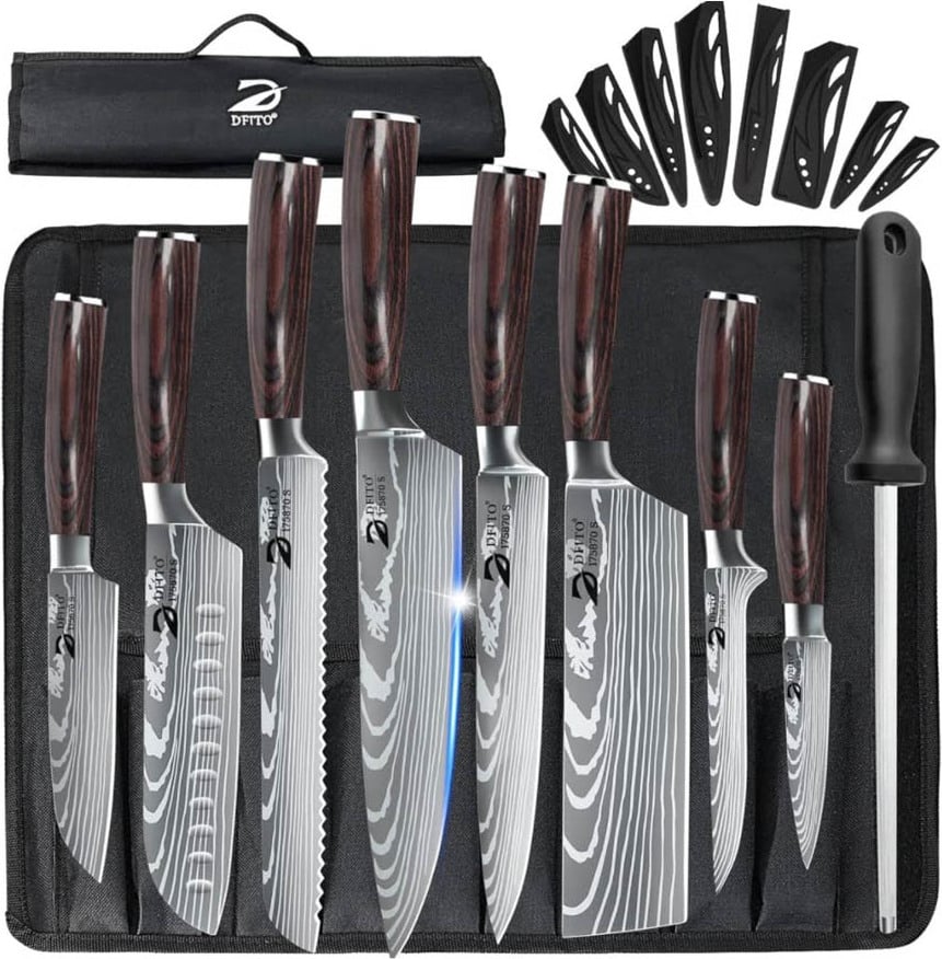 Set de couteaux de cuisine Dfito, 8 pièces, couteau de chef professionnel, acier inoxydable à haute teneur en carbone, extrêmement tranchant, étui à roulettes inclus, polyvalent, idéal pour les cuisiniers amateurs et professionnels.