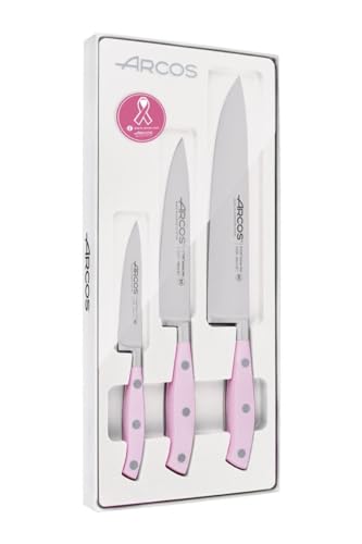 Arcos Ensemble de Couteaux de Cuisine Professionnels Forgés – 3 Couteaux pour Couper et Peler les Aliments, Poignée Ergonomique en Polyoxyméthylène – Série Riviera, Couleur Rose