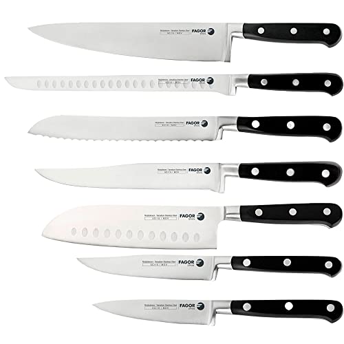 Fagor Couper Lot de 7 couteaux de cuisine professionnels, lame en acier inoxydable, chef 25 cm, jambon 27,5 cm, Santoku, pain, trancher, universel, peler, manche ergonomique