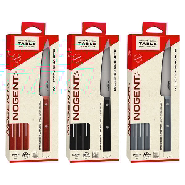 Lot de 3 coffrets de 4 couteaux de table Silhouette rouge vin, bleu-gris et noir Nogent
