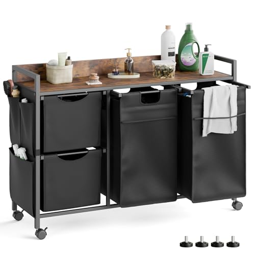 Mondeer Panier à Linge avec Compartiments, Trieur de Linge avec roulettes, Panier à Linge avec Poches Latérales, Doublures Amovibles et Couvercle Extensible, pour Chambre et Salle de Bain (150L)
