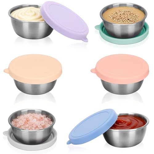 Romon Mini Pots a Sauce avec Couvercles, 6 Pièces 50ml Mini Récipient Vinaigrette en Acier Inoxydable 304, Couvercles en Silicone Colorés, Pot Confiture pour Pique-nique et Lunch, Idéal pour Salade