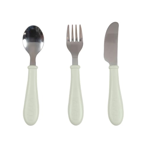 BÉABA, Set de 3 Couverts Enfant d'Apprentissage - Inox - 2ème Âge, Dès 12 mois - Prise en main facile pour Bébé, Vert de gris
