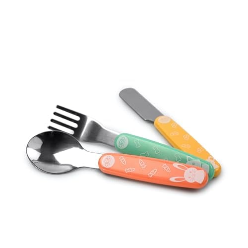 BÉABA, Set de 3 Couverts Enfant d'Apprentissage - Inox - 2ème Âge, Dès 12 mois - Prise en main facile pour Bébé, Barbe à papa