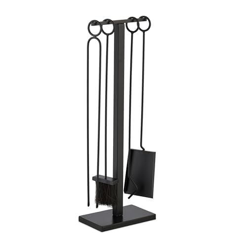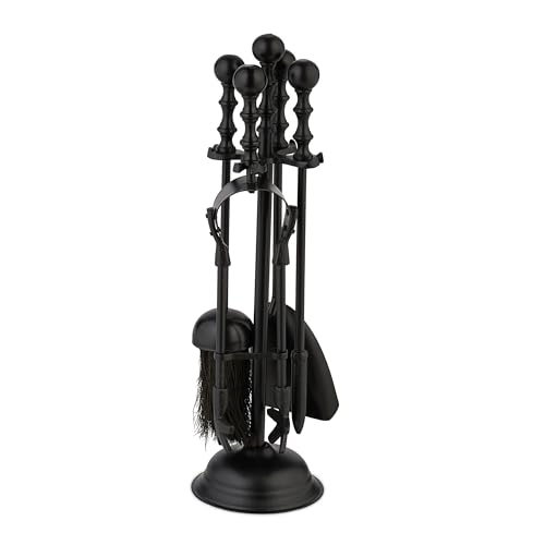 Relaxdays Couverts de cheminée, Lot de 5 pièces, tisonnier, Pelle & Balai à Cendres, Pince, Support, pour poêle, Noir