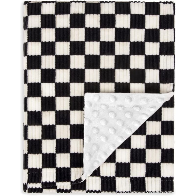 Couverture pour bébé, confortable et durable, en polaire corail, double épaisseur, motif damier à pois, noir, 70 x 100 cm