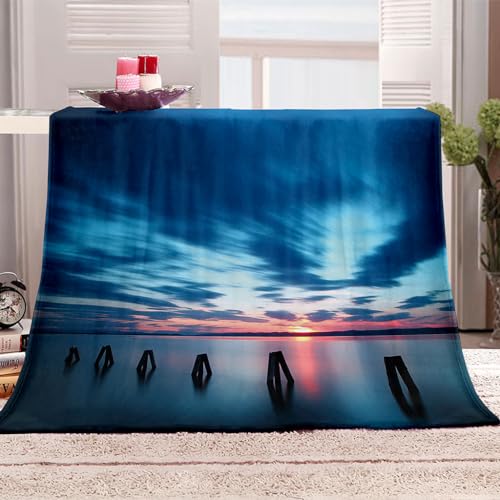 Plaid Couverture Polaire Flanelle en Microfibre, Couverture De Lit 1 Personne 80X150Cm Coucher De Soleil Bleu sur Un Paysage Marin Plaid Fourrure Canapé Grande Taille, Couverture Chaude Douce en PE