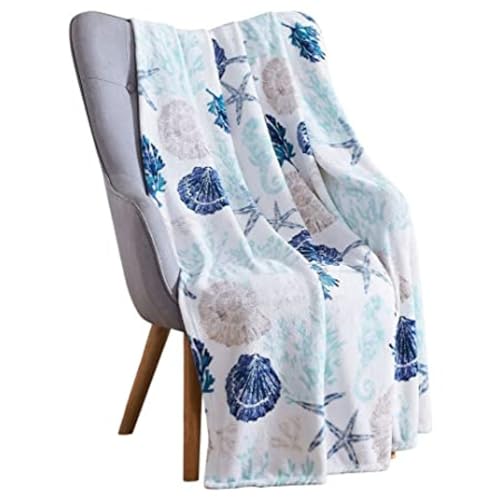Serafina Home Couverture décorative Ocean Life Coastal : Polaire en Velours Doux et Doux, Teintes de Bleu Beige sur Blanc, Accent pour canapé, Chaise, lit ou dortoir (Coquillages côtiers)