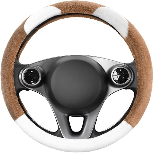 Upgrade4cars Couvre Volant Voiture Peluche Marron Blanc | Accessoires Auto Interieur | Taille Universel 37-39 cm | Cadeaux pour Femmes et Hommes | Decoration pour l'été et l'hiver