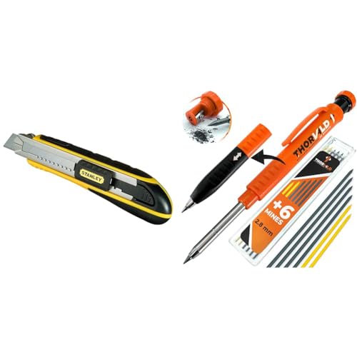 STANLEY FATMAX Cutter à Cartouche - Chariot en Acier Inoxydable, 6 Lames 18 mm & Crayon Chantier PRO EXTENSIBLE [+ 7 MINE Multi-Supports + Taille Mine + Grip Easy-write] Porte Mine pour Menuisier