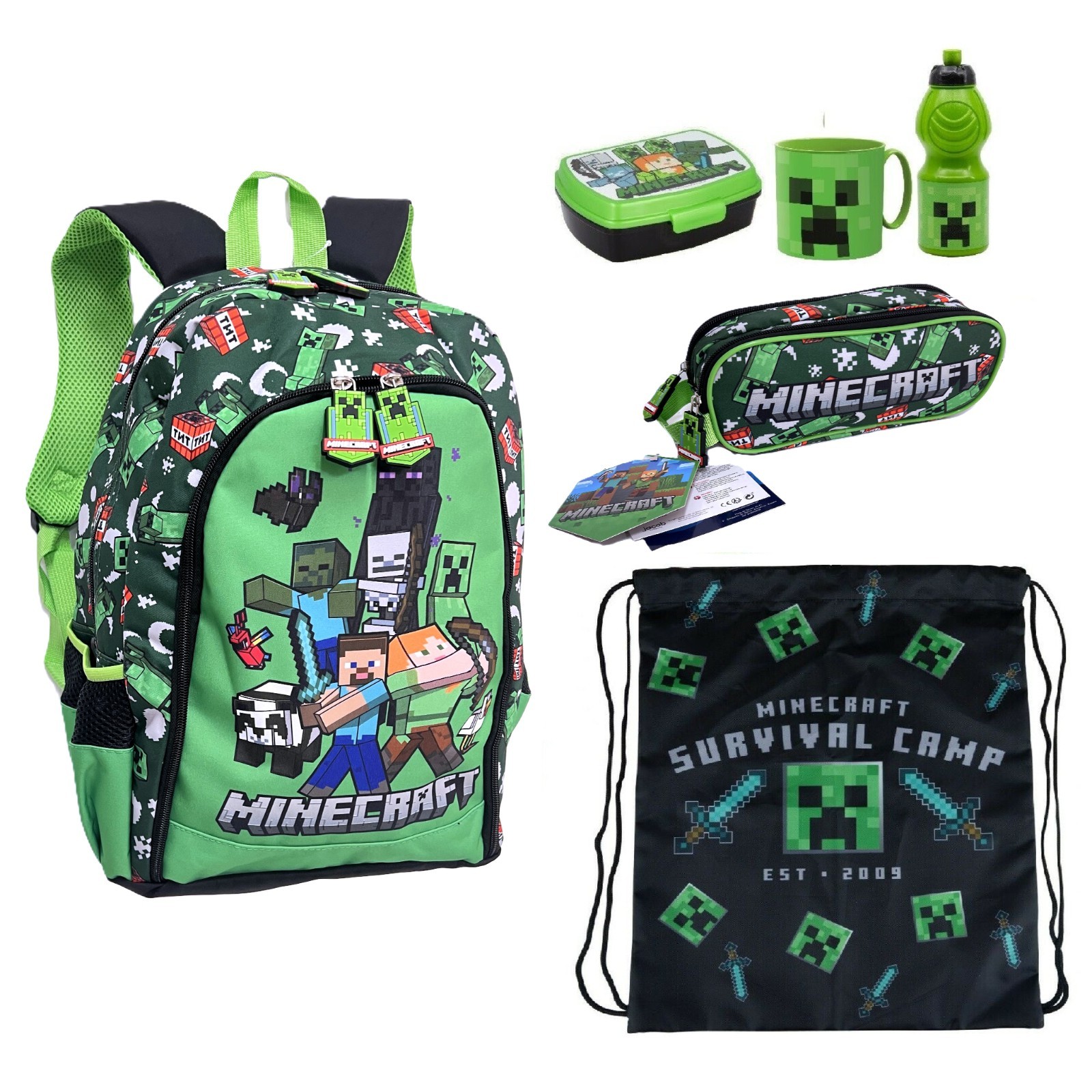 Minecraft Creeper Sac à Dos pour garçon Creeper TNT 5 pièces | Sac à Dos Gamer Crayon et étui Bouteille Taille Unique, Noir, Ensemble Cartable