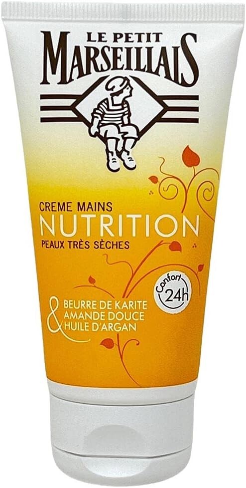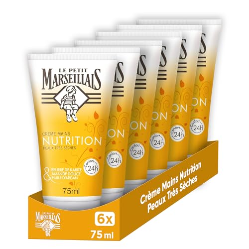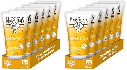 Le Petit Marseillais | Crème Mains Nutrition Peaux Très Sèches (lot de 6 tubes de 75 ml) – Crème pour les mains au beurre de karité, amande douce & huile d'argan – Soin des mains pour 24h de confort
