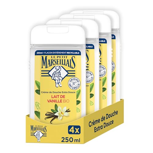 Le Petit Marseillais | Crème de Douche Extra Douce Lait de Vanille Bio (lot de 4 flacons de 250 ml) – 92% d'ingrédients d'origine naturelle – Flacon entièrement recyclable