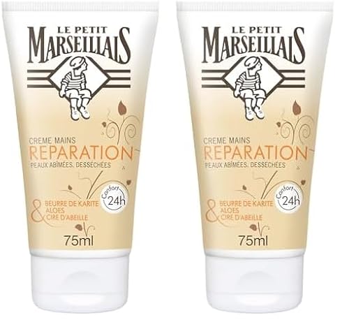 Le Petit Marseillais - Crème Mains Réparation Peaux Abîmées et Desséchées (lot de 2 tubes de 75 ml) – Crème réparatrice au beurre de karité, aloès et cire d'abeille – Soin des mains confort 24 h