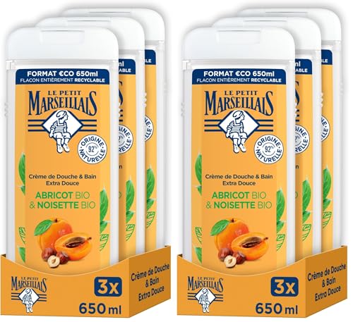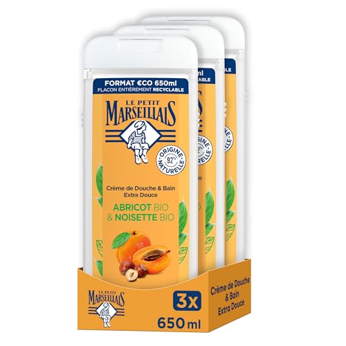 Le Petit Marseillais - Crème de Douche & Bain Extra Douce Abricot Bio & Noisette Bio (flacon de 650 ml) – Gel douche avec 92% d'ingrédients d'origine naturelle – pH neutre pour la peau (Lot de 3)