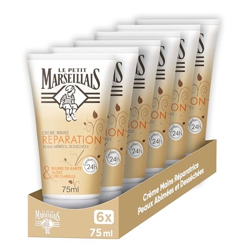 Le Petit Marseillais | Crème Mains Réparation Peaux Abîmées et Desséchées (lot de 6 tubes de 75 ml) – Crème réparatrice au beurre de karité, aloès et cire d'abeille – Soin des mains confort 24 h
