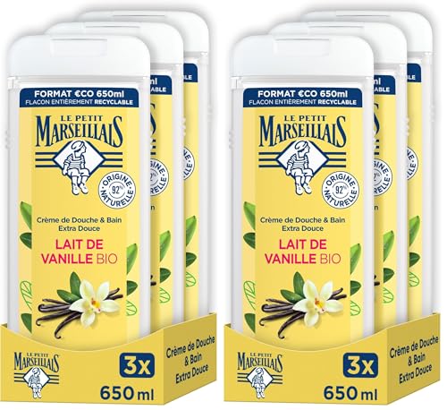 Le Petit Marseillais Crème de Douche Extra Douce Lait de Vanille BIO (lot de 6x650 ml) –avec 92% d'ingrédients d'origine naturelle – pH neutre pour la peau et sans colorant