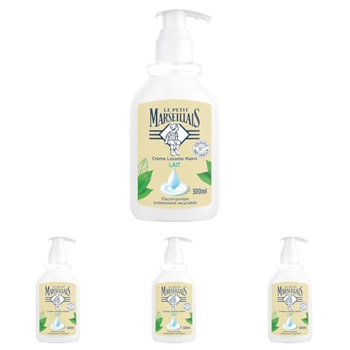 Le Petit Marseillais | Crème Lavante Mains Lait (flacon-pompe de 300 ml) – Savon mains liquide fabriqué à partir de lait végétal – 92% d'origine naturelle et pH neutre pour la peau (Lot de 4)