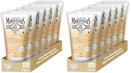 Le Petit Marseillais | Crème Mains Réparation Peaux Abîmées et Desséchées (lot de 12 tubes de 75 ml) – Crème réparatrice au beurre de karité, aloès et cire d'abeille – Soin des mains confort 24 h