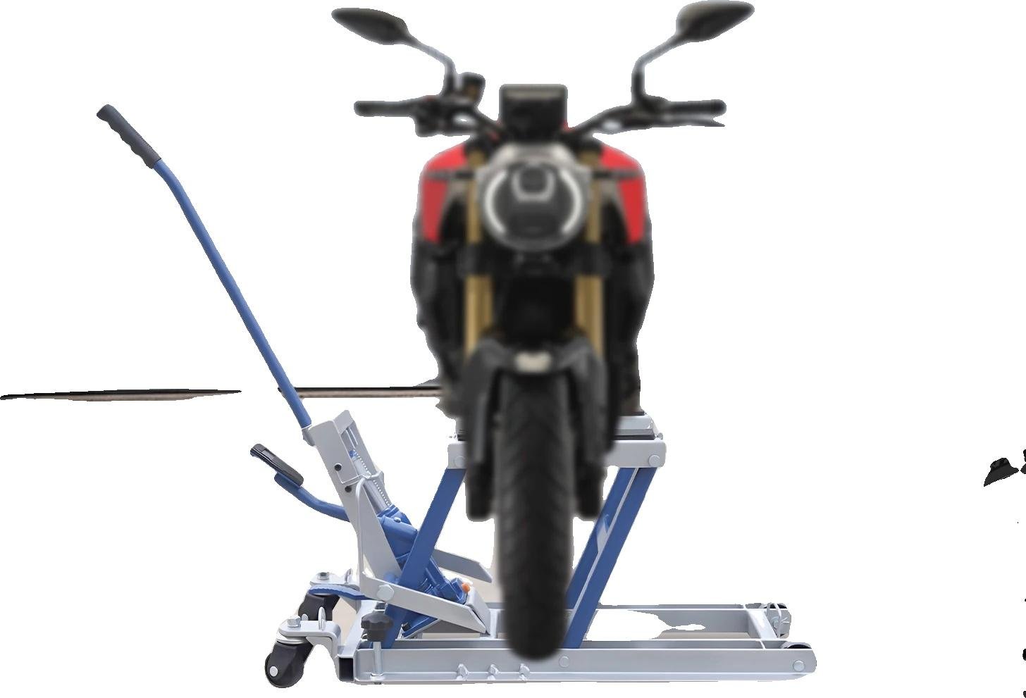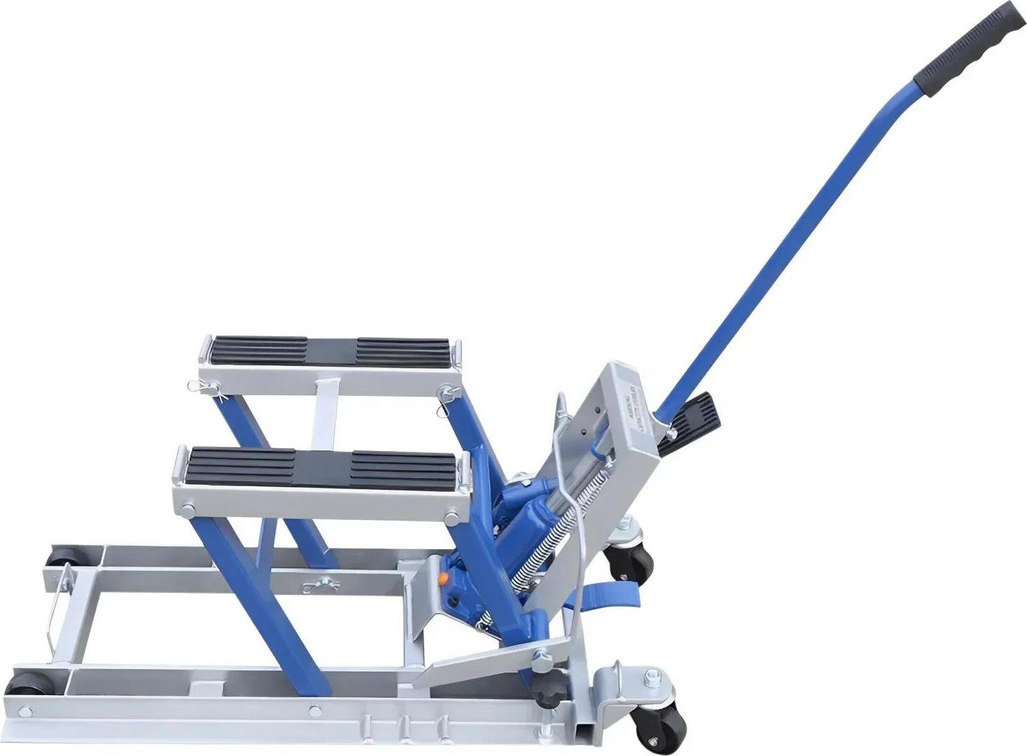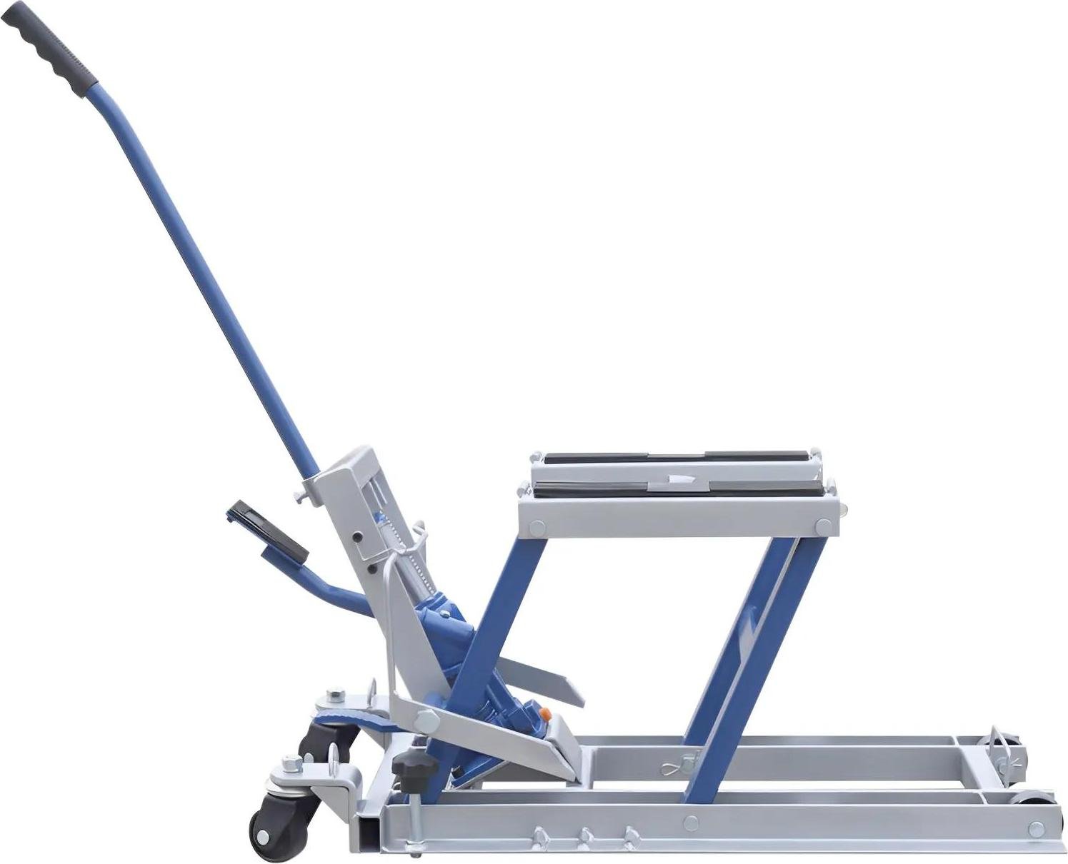 Cric pour moto/quad - Pont élévateur hydraulique - Capacité de charge 680 kg - Hauteur de levage 12–38,7 cm - Roulettes pivotantes x2 - Acier A3, caoutchouc - Bleu