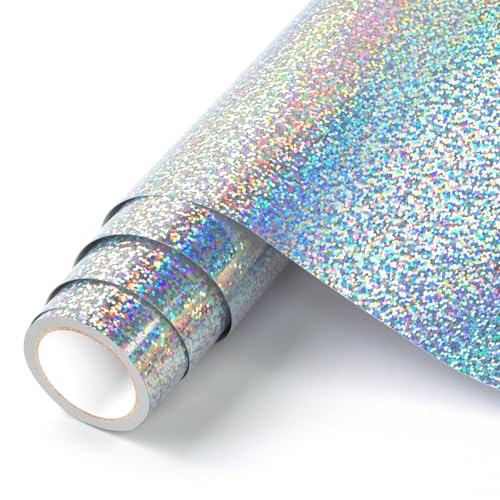 HKC Vinyle Adhésif Argent laser, 30.5cm x 183cm Rouleau de Vinyl Permanent, Vinilo Adhesivo pour Cricut, pour Silhouette Cameo, Film auto-Adhésif pour Mug DIY, Fenêtre, Céramique, Plastique