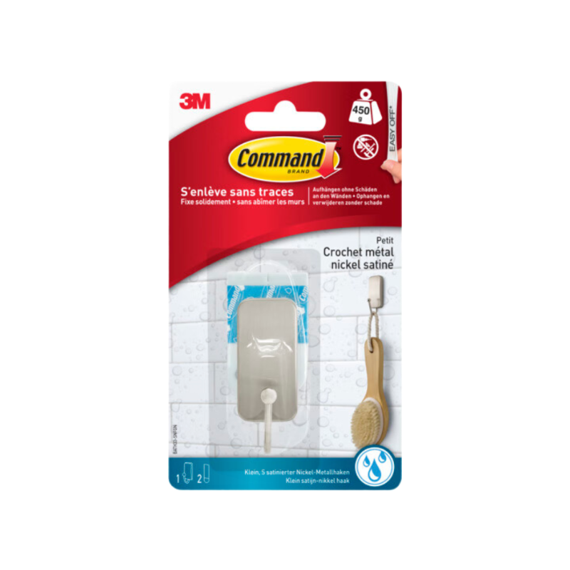 1 Grand crochet 3M Command¿ Métal brossé avec languettes résistantes à l'eau, 2 languettes, 2,3kg