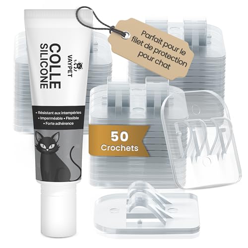 VAYPET® 50 Crochet Adhésif Mural & Colle Silicone [30ml] pour Filet pour Chat Balcon sans Perçage I Crochet Fixation Filet Chat, Crochet adhésif extérieur - Protection Fenêtre Chat sans Percer