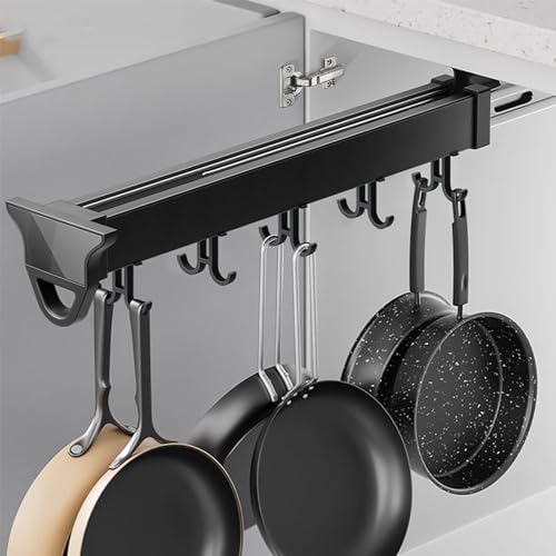 Rail de crochet de cuisine, support de couvercle de casserole extractible avec rail coulissant, organisateur de casseroles et poêles extensible avec 12 crochets, rangement de couvercle de casserole,