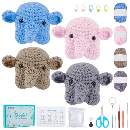 FREEBLOSS 4Set Kit Crochet Animaux Crochet Porte-clés Kit Crochet Kit Crochet Débutant Kits de Crochet pour Porte-clés éléphant Kit d'Animaux a Crocheter pour Adultes Kit de Crochet avec Instructions