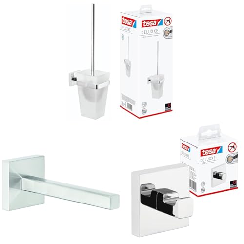Ensemble de brosses de Toilettes tesa DELUXXE, chromé, avec Verre satiné & Porte-Rouleau de Rechange pour Papier Toilette & Crochet pour Serviette à Fixer au Mur sans perçage