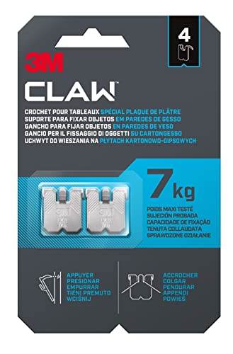 3M CLAW Crochets pour Accrocher des Tableaux sur des murs en plâtre, 4 Crochets - Poids Maxi testé jusqu'à 7 kg - Idéal pour Fixer des Objets lourds, Miroirs, Décoration d'intérieur, sans Outil