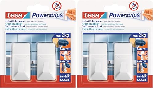 Tesa Powerstrips LARGE Crochets Métalliques de Fixation Auto-Adhésifs - Charge Jusqu'à 2 kg - Repositionnables, Forme rectangulaire - blanc - Pour toute la Maison (Lot de 2)