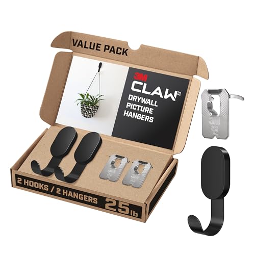 3M Claw (TM) 11,3 kg. 2 crochets noirs pour cloison sèche et 2 crochets pour tableaux, solution de suspension lourde pour sacs à dos, vestes, photos et décoration d'intérieur - Lot de 4