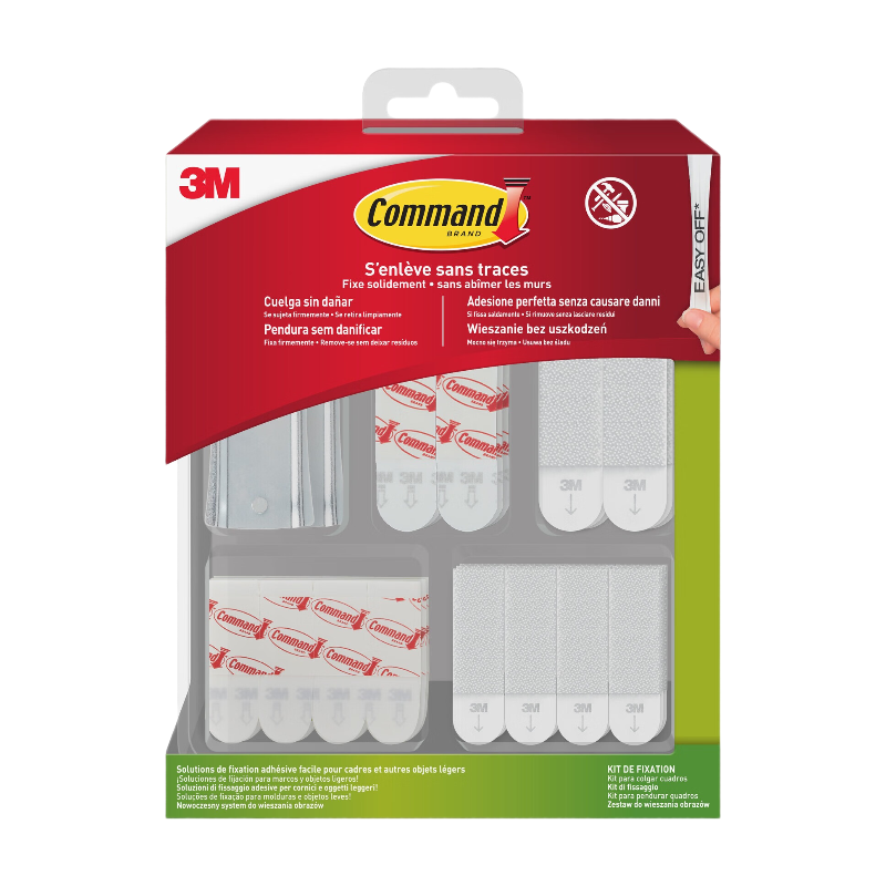 Command™Kit multi fixation : 2 crochets universels adhésifs pour tableaux, 12 languettes pour posters, 6 grandes languettes adhésives, 8 paires de petites languettes accroches tableaux et 6 paires de grandes languettes accroches tableaux