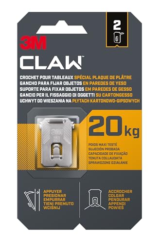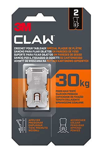 3M CLAW Crochets pour Accrocher des Tableaux sur des murs en plâtre, 2 Crochets - Poids Maxi testé jusqu'à 30 kg - Idéal pour Fixer des Objets lourds, Miroirs, Décoration d'intérieur, sans Outil