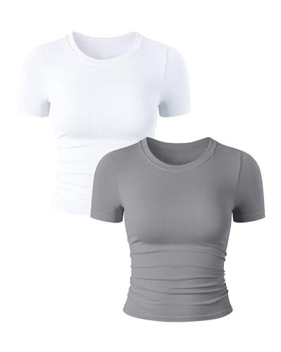 hixswnu 2 Pièce Femmes Casual De Base Sortir Crop Tops Slim Fit Manches Courtes Serré T-Shirts Workout Tops,010,S