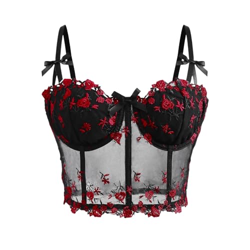 Bustier Femme,Corsets Sexy Pour Femmes Broderie De Fleurs Noires Rétro Bustier Corset D'Été Bretelles Spaghetti Minces Push Up Crop Tops Soutien-Gorge Y2K Voir À Travers Mesh Camis Vest Streetwe