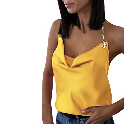 Femmes Dos Nu Halter Débardeur Été Satin Camisoles Gilet Mince Solide Chaîne Sangle Crop Tops Mousseline De Soie sans Manches Camisole Clubwear Streetwear,Jaune,L